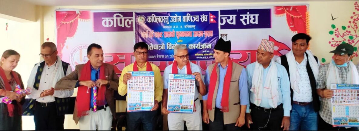 कपिलवस्तु उद्योग वाणिज्य संघ वाणगंगाले एक समारोहबीच नयाँ वर्ष २०७९ को भित्ते पात्रो एक समारोहबीच विमोचन गरेको छ । लुम्बिनी प्रदेश सभा सदस्य विष्णु पन्थी तथा पूर्व मन्त्री दीप कुमार उपाध्यायले संयुक्त रुपमा नयाँ वर्षको क्यालेण्डर विमोचन गर्नुभएको हो । कार्यक्रमका प्रमुख अतिथी दिप कुमार उपाध्यायले मुलुक यतिवेला आर्थिक संकटमा गुज्रिरहेका बेला सवैले आआफनो ठाउँबाट इमान्दारिपूर्वक जिम्मेवारी पुरा गर्नुपर्ने बताउनुभयो । उहाँले चुनाव नजिकिदै गर्दा गठबन्धनका कारण असहज परिस्थिती आउन सक्ने भन्दै सवै दलहरुलाई सकारात्मक सोचको विकास गरेर अघि बढ्न आग्रह गर्नुभएको थियो ।