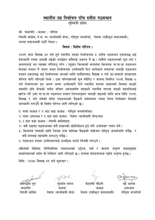 यसभन्दा अगाडी गठबन्धन दलहरु एकताबद्ध भई निर्वाचनमा जानको लागि पार्टीहरुबाट वैशाख ७ गते आ-आफ्नो मातहतमा परिपत्र जारी गरिएको थियो । उक्त परिपत्रहरूको मूल स्पिरिट र भावना विपरित वैशाख ८ गते निर्वाचनमा अलग अलग उम्मेदवारी दिने स्थानीय स्तरमा दलहरूको बीचमा भएको सहमति खारेज गरेको हो ।