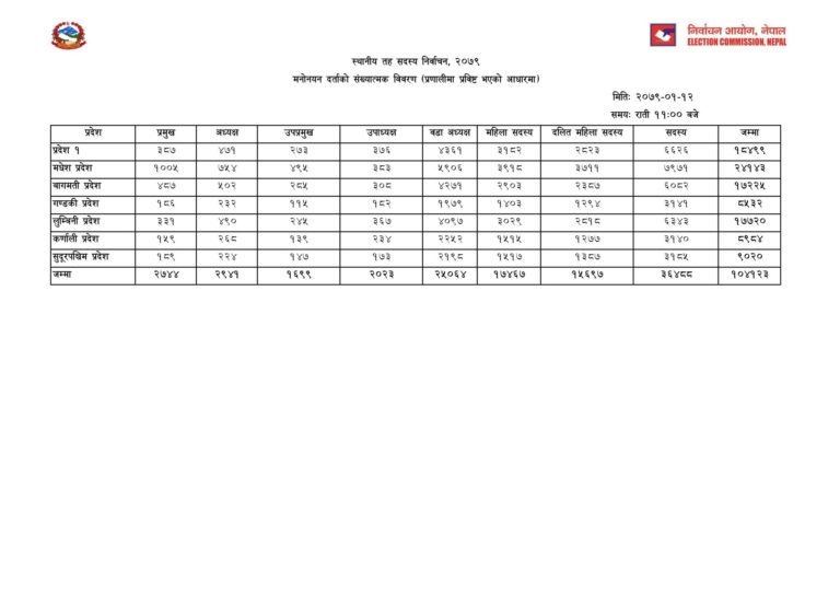 वैशाख ३० गतेको स्थानीय तह निर्वाचनका लागि १ लाख ४ हजार १ सय २३ जनाले मनोनयन दर्ता गरेका छन् ।