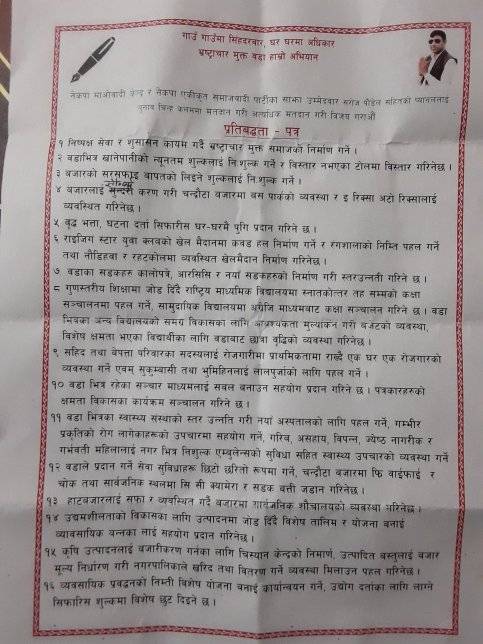 गठबन्धनका साझा उम्मेदवारको रूपमा रहेका पौडेल नेकपा (एस)बाट वडा अध्यक्ष पदका लागि चुनावी मैदानमा छन् । शिवराज नगरपालिकाको केन्द्रको रूपमा रहेको चन्द्रौटा बजारलाई सुन्दरीकरण गर्नका लागि आफूले विभिन्न योजनाहरू ल्याउने पौडेलले प्रतिबद्धता व्यक्त गर्नुभएको छ । आज पत्रकार सम्मेलन गरी पौडेलले ५ बर्षे कार्यकालमा गर्ने योजनाहरू सार्वजनिक गर्नुभएको छ । जसको पहिलो नम्बरमा निष्पक्ष सेवा र सुशासन कायम गर्दै भष्टचार मुक्त समाजको निर्माण गर्ने उल्लेख गरिएको छ ।