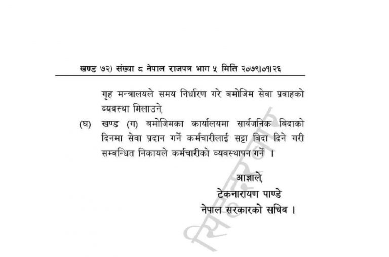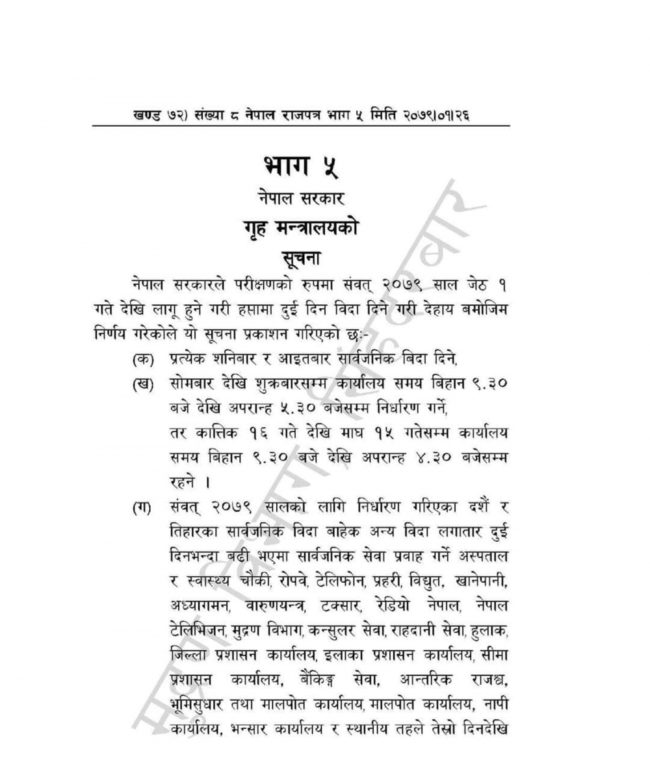 सरकारले हप्तामा दुई दिन बिदा दिने सूचना राजपत्रमा प्रकाशित गरेको छ । जेठ १ गतेदेखि शनिबार र आइतबार बिदा दिने निर्णय गृहमन्त्रालयले राजपत्रमा प्रकाशित गरेको हो ।