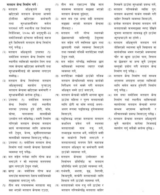 यही वैशाख ३० गते स्थानीय तह निर्वाचन हुँदैछ । निर्वाचनका लागि मतदान अधिकृतले स्थानीय तह निर्वाचन निर्देशिका, २०७८ को अनुसूची-३३ बमोजिमको हुने किसिमले मतदान केन्द्र बनाउनुपर्छ ।