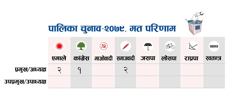 नतिजाअनुसार अध्यक्षमा एमाले र एकीकृत समाजवादीले दुईरदुई तथा कांग्रेसले एक ठाउँमा जित हासिल गरेको छ ।