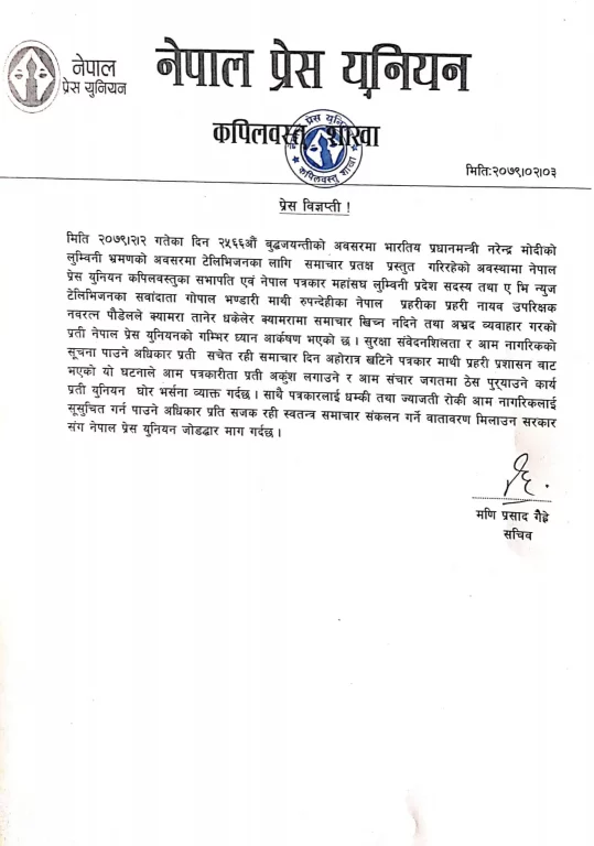 २५६६औं बुद्धजयन्तीको अवसरमा भारतीय प्रधानमन्त्री नरेन्द्र मोदीको लुम्बिनी भ्रमणको अवसरमा समाचार संकलन गरिरहेको अवस्थामा पत्रकार गोपाल भण्डारी माथि भएको अभद्र व्यवाहार प्रति नेपाल प्रेस युनियन कपिलवस्तुले आपत्ति जनाएको छ ।