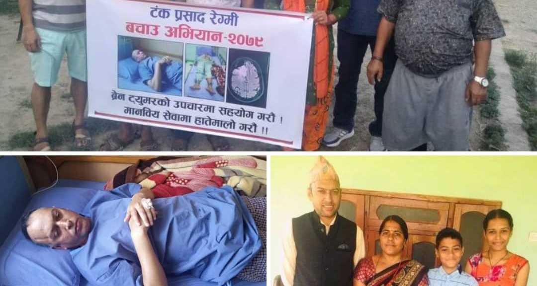 ब्रेन ट्युमर भएपछि सुरुमा उनले उपचार गरे तर ७ बर्षपछि फेरी ट्युमर पलाएपछि अप्रेसन गर्नु पर्ने रेग्मीको अवस्था छ । पहिले नै उपचार गर्दा सम्पति सकेर टाँट पल्टेका टंकलाई यतिखेर भने त्यस्तै अप्रेसनको लागि मोटो रकमको आवश्यकता देखिएको पारिवारिक श्रोतले मायादेवी अनलाइनलाई बतायो ।