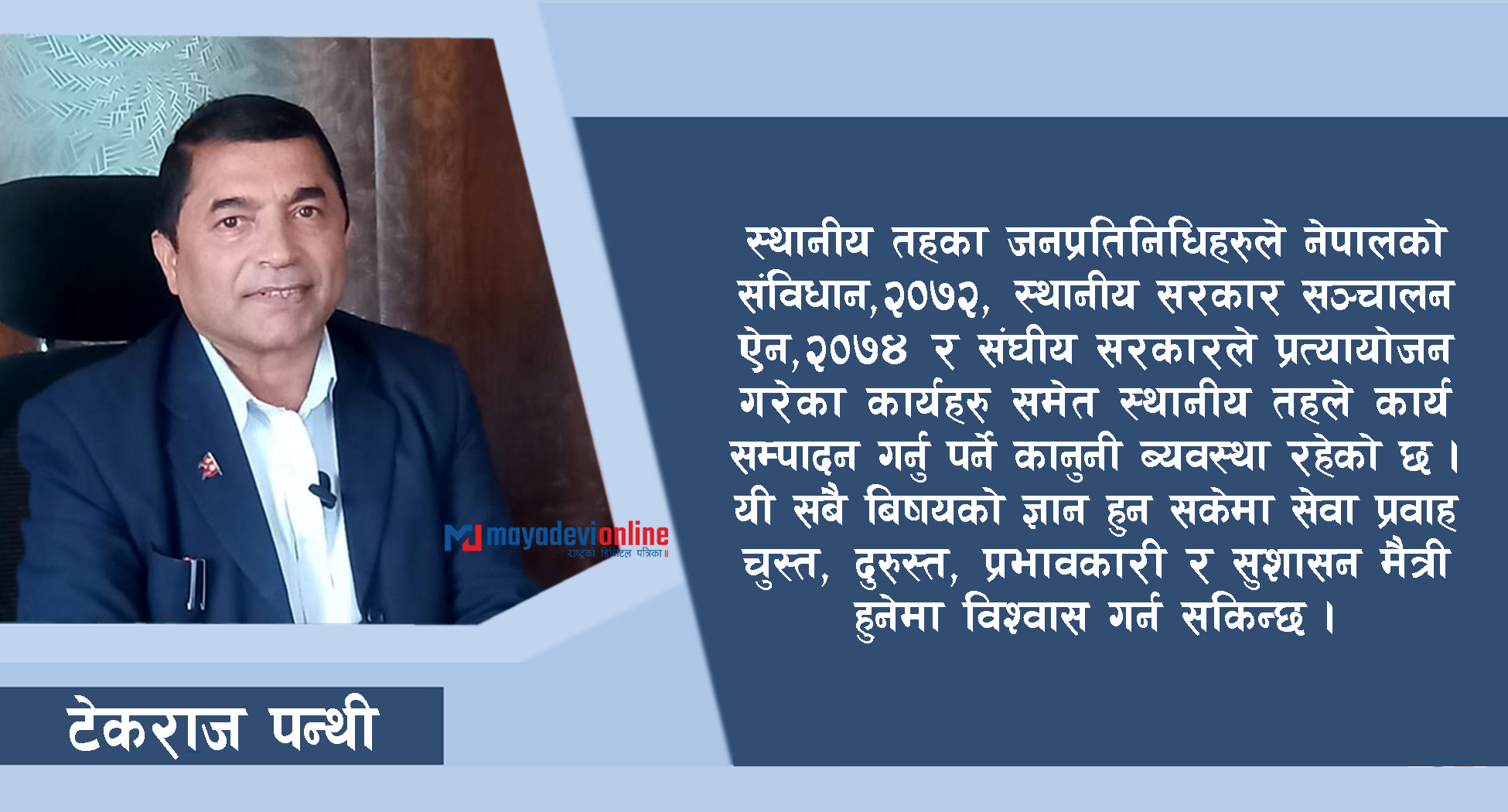 अन्त्यमा, स्थानीय तहका जनप्रतिनिधिहरुले नेपालको संविधान, २०७२, स्थानीय सरकार सञ्चालन ऐन, २०७४ र संघीय सरकारले प्रत्यायोजन गरेका कार्यहरु समेत स्थानीय तहले कार्य सम्पादन गर्नु पर्ने कानुनी ब्यवस्था रहेको छ । यी सबै बिषयको ज्ञान हुन सकेमा सेवा प्रवाह चुस्त, दुरुस्त, प्रभावकारी र सुशासन मैत्री हुनेमा विश्वास गर्न सकिन्छ ।