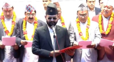 काठमाण्डौ । काठमाण्डौ महानगरपालिकाका मेयर बालेन्द्र साहले पदबहाली गर्नुभएको छ । राष्ट्रिय सभा गृहमा शपथ
