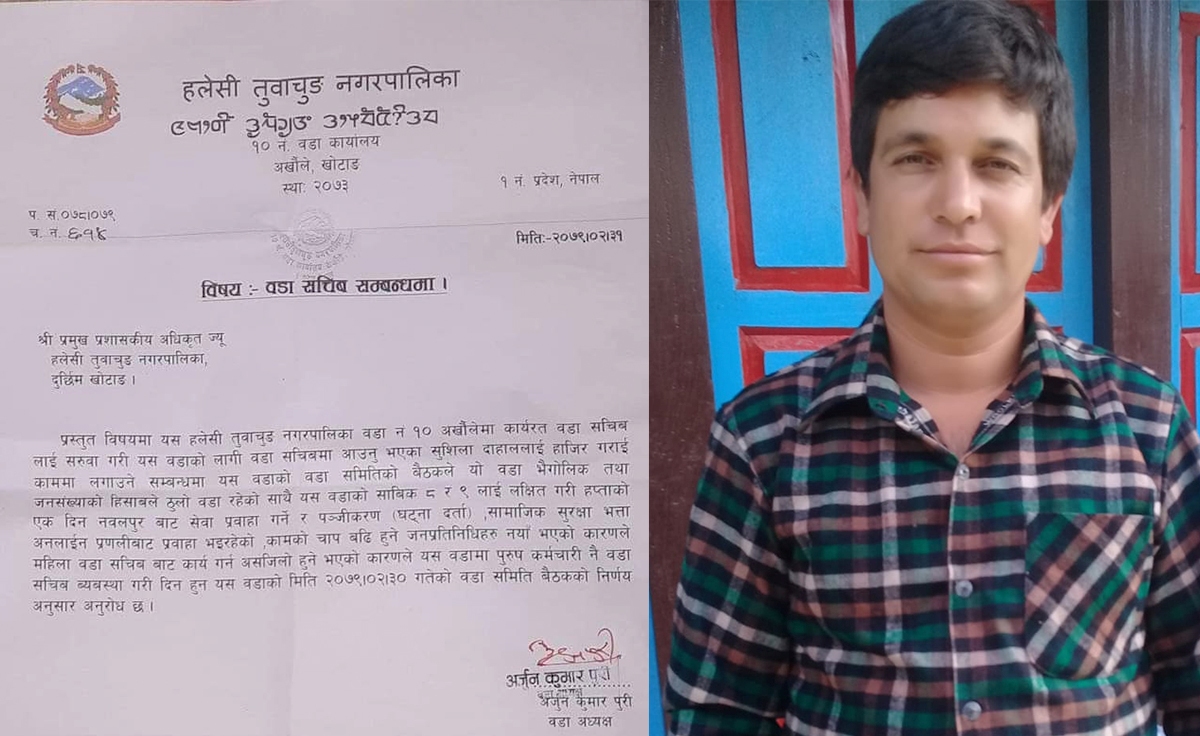 खोटाङको हलेसी तुवाचुङ नगरपालिका-१० का वडाध्यक्ष अर्जुनकुमार पुरीले पुरुष कर्मचारी माग गरेका छन् । उनले महिला कर्मचारीसँग काम गर्न असहज हुने भन्दै पुरुष कर्मचारी माग गरेका हुन् ।