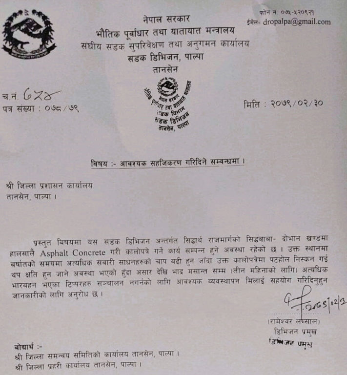सिद्धार्थ राजर्माग अन्तर्गत बुटवल–पाल्पा सडकखण्डमा टिपर चलाउन रोक लागाइएको छ । सडक डिभिजन कार्यालय पाल्पाले एक सूचना जारी गर्दै भदौ मसान्तसम्म तीन महिनाका लागि सिद्धार्थ राजमार्गको तानसेन बुटवल सडक खण्डमा टिपर सञ्चालनमा रोक लगाएको हो ।