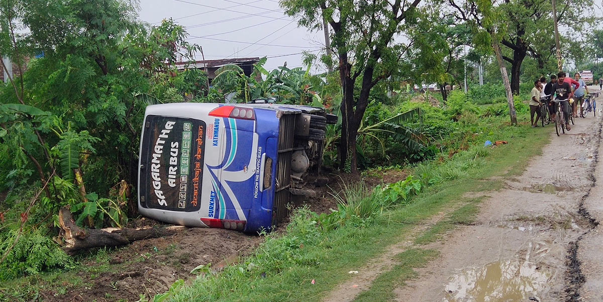 बिहान करिब ६ बजेको समयमा ना८ख १३६ नम्बरको बस सडक छेउमा पल्टिएको हो । ४३ जना सवार उक्त बस तीव्र गतिका कारण आफैं अनियन्त्रित भइ दुर्घटना भएको ट्राफिक प्रहरी कार्यालय चन्द्रोटाले जनाएको छ । रासस