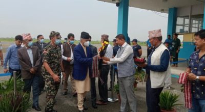 भैरहवा । प्रधानमन्त्री शेर बहादुर देउवा र शिक्षामन्त्री देवेन्द्र कंडेल सवार रहेको नेपाली सेनाको हेलिकप्टर