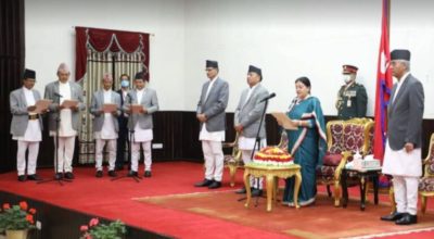 काठमाडौं । एकीकृत समाजवादीबाट नवनियुक्त मन्त्रीहरूले पद तथा गोपनीयताको शपथ लिएका छन् । राष्ट्रपति विद्यादेवी