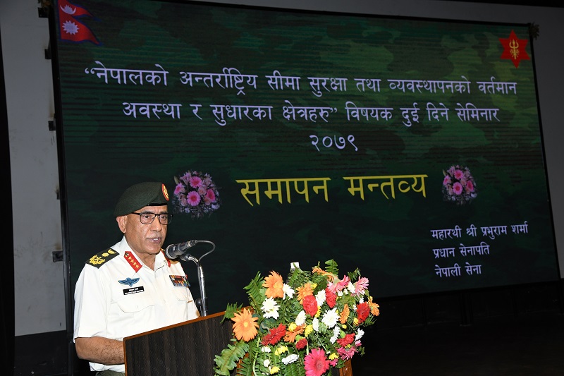 सेनाले गरेको नेपालको अन्तर्राष्ट्रिय सीमा सुरक्षा तथा व्यवस्थापनको वर्तमान अवस्था र सुरक्षाका क्षेत्रहरु विषयक दुई दिने सेमिनारको हिजो समापन गर्दै प्रधानसेनापति शर्माले सीमा क्षेत्रमा चुनौती बढ्दै गएकाले सबैले चनाखो भएर काम गर्नुपर्ने बताउनुभएको हो ।