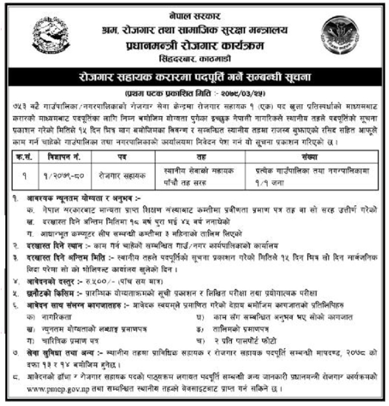 ७ सय ५३ वटै पालिकाका रोजगार सेवा केन्द्रमा रिक्त रहेको रोजगार सहायक पदमा पदपूर्तिका लागि प्रधानमन्त्री रोजगार कार्यक्रमले दरखास्त आह्वान गरेको छ ।