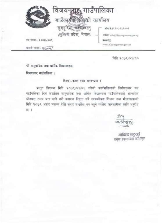 कपिलवस्तुको विजयनगर गाउँपालिकाले असार मसान्त पछि स्वयमसेवक शिक्षक र मौलानाहरुको म्याद थप नहुने प्रष्ट पारेको छ ।