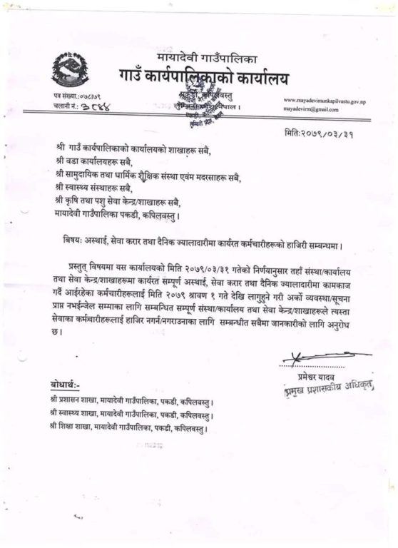 कपिलवस्तुको मायादेवी गाउँपालिकाले अस्थायी, करार र ज्यालादारी कर्मचारीलाई हटायो