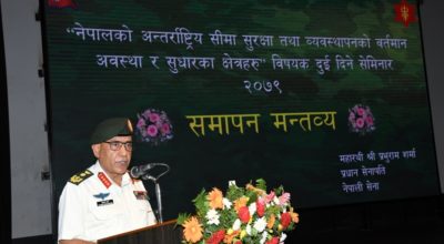 काठमाडौं ।प्रधानसेनापति प्रभुराम शर्माले अन्तर्राष्ट्रिय सीमा सुरक्षामा सबै पक्ष चनाखो रहनुपर्ने बताउनुभएको छ । सेनाले