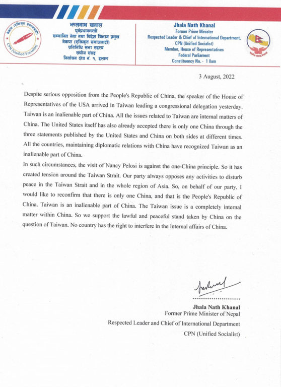 पूर्वप्रधानमन्त्री तथा नेकपा एकीकृत समाजवादीका सम्मानित नेता झलनाथ खनालले अमेरिकी संसदकी सभामुख न्यान्सी पेलोसीले गरेको ताइवान भ्रमणप्रति आपत्ति जनाएका छन् ।