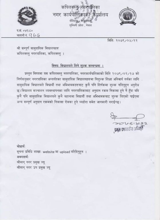 कपिलवस्तु नगरपालिकाले साहसिक निर्णय गरेको छ । जिल्ला सदरमुकाममा रहेको कपिलवस्तु नगरपालिकाले आफू मातहतका सामुदायिक विद्यालयहरुलाई शूल्क नलिन निर्देशन जारी गरेको छ ।