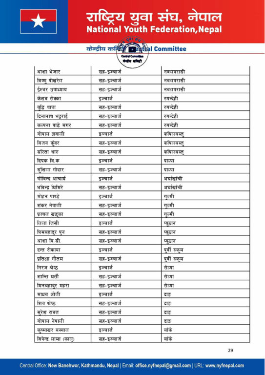 राष्ट्रिय युवा संघले कपिलवस्तुका लागि जिल्ला इन्चार्जको जिम्मेवारी गोपाल ज्ञवालीलाई दिएको छ । यस्तै सह-इन्चार्जको जिम्मेवारी सरिता थारु र विजय कुवँरले पाएका छन् ।