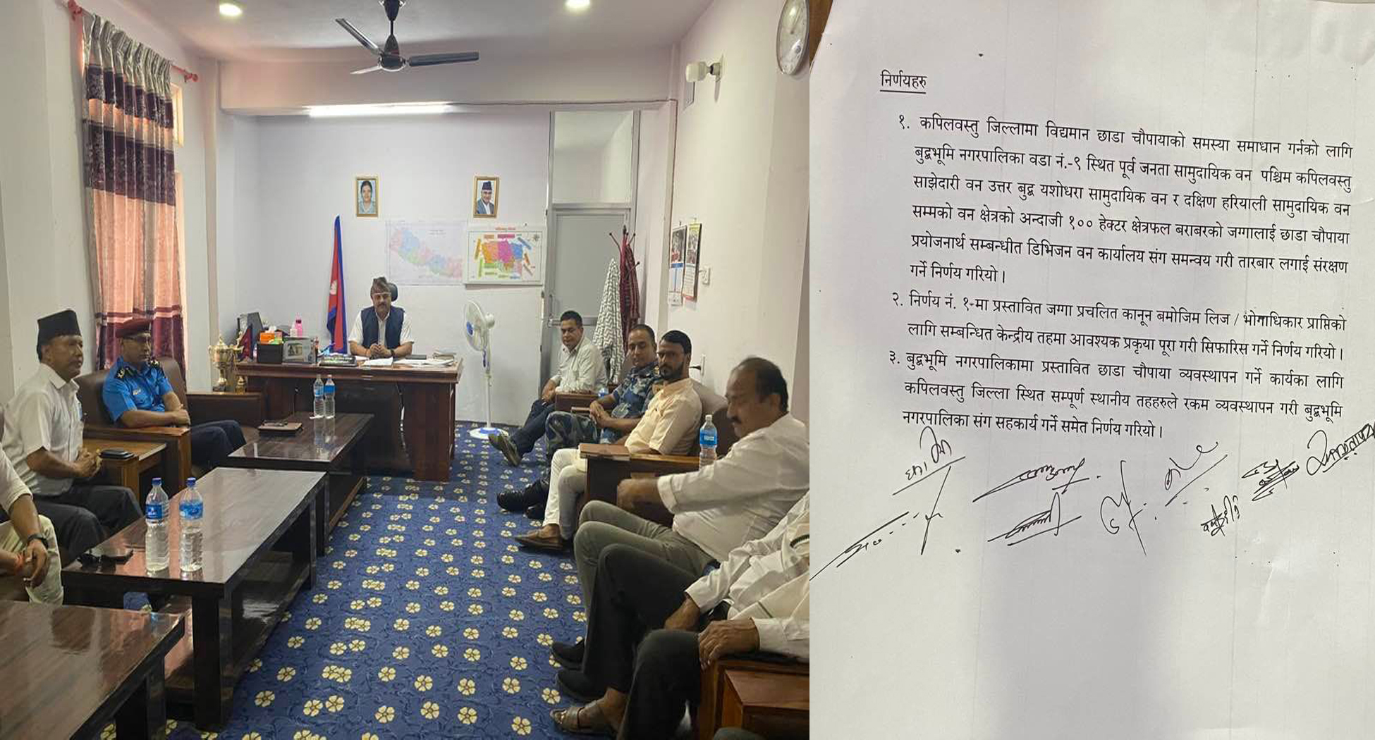 प्रस्तावित जग्गा प्रचलित कानून बमोजिम लिज र भोगाधिकार प्राप्तिका लागि सम्बन्धित केन्द्रीय तहमा आवश्यक प्रकृया पूरा गरि सिफारिश गर्ने तथा प्रस्तावित छाडा चौपायाको व्यवस्थापन गर्न जिल्लाका सम्पूर्ण स्थानीय तहहरूले रकम व्यवस्थापन गरी बुद्धभूमि नगरपालिकासंग सहकार्य गर्ने निर्णय भएको हो ।