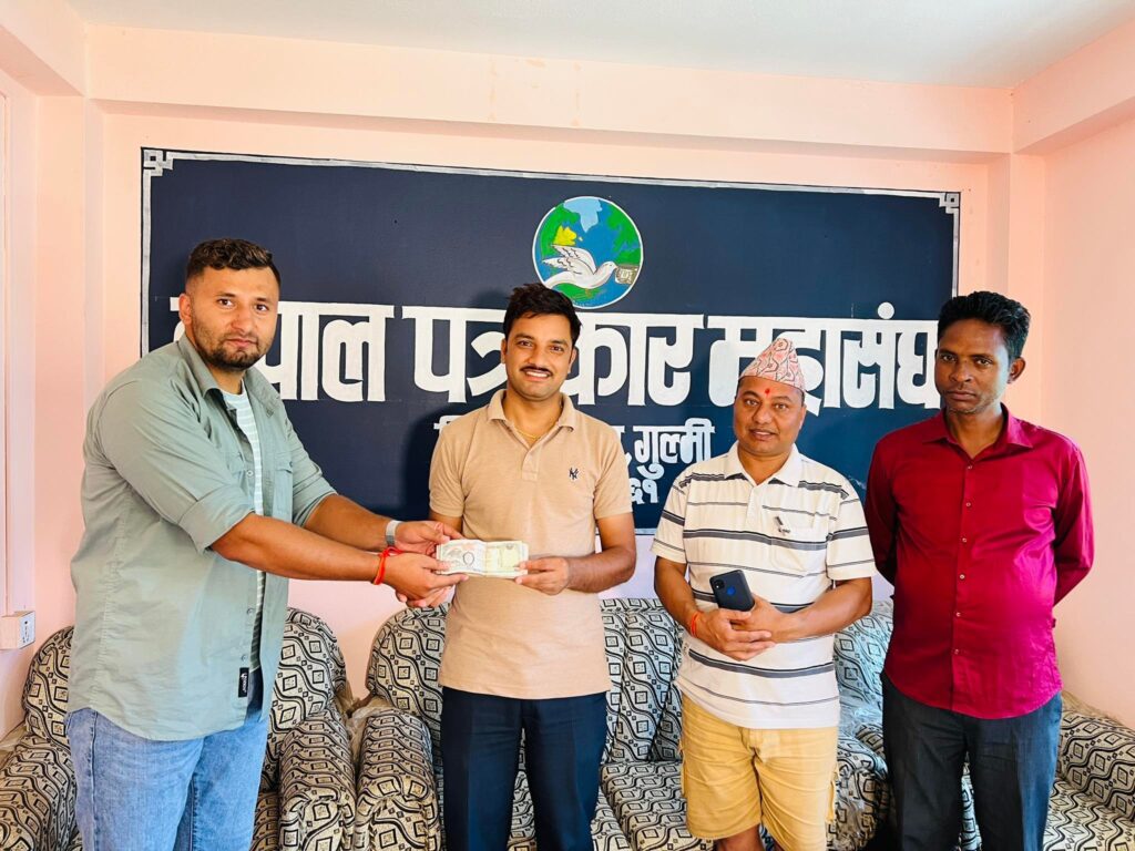 शनिबार बिहान नेपाल अपडेट यूट्यूब च्यानलका सञ्चालक मोहन बस्नेतमार्फत गुल्मेली सेवा समाज जापानले नेपाल पत्रकार महासंघ गुल्मीको संस्थागत विकासका लागि एक लाख रुपैयाँ नगद सहयोग हस्तान्तरण गरेको हो ।