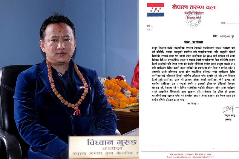 तरुण दलका अध्यक्ष विद्वान गुरुङले प्रेस विज्ञप्ति जारी गर्दै नागरिकता विधेयक फिर्ता गरेर राष्ट्रपतिले जनतामाथि खेलबाड गरेको भन्दै राजीनामा माग माग्दै राजीनामा नदिए महाअभियोग लगाउनुपर्ने माग गरेका हुन्।