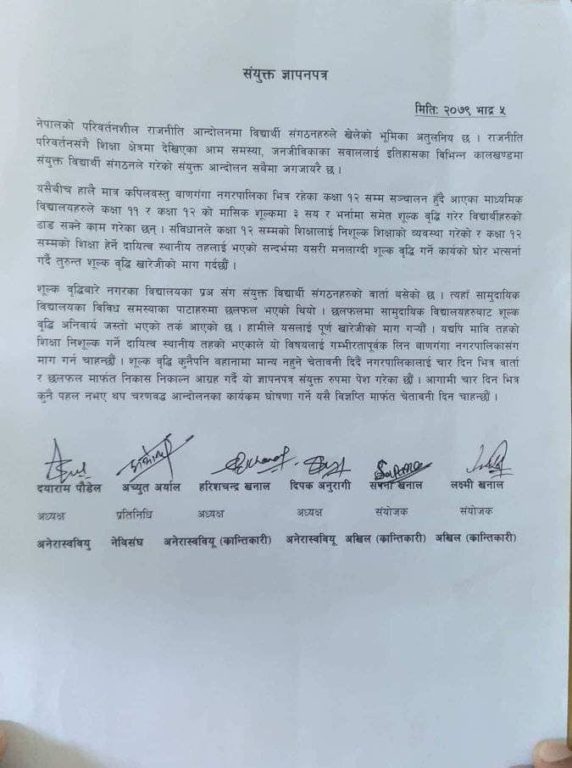 शूल्क वृद्धिबारे नगरका विद्यालयका प्रअ संग संयुक्त विद्यार्थी संगठनहरुको वार्ता बसेको छ । त्यहाँ सामुदायिक विद्यालयका विविध समस्याका पाटाहरुमा छलफल भएको थियो । छलफलमा सामुदायिक विद्यालयहरुबाट शूल्क वृद्धि अनिवार्य जस्तो भएको तर्क आएको छ । हामीले यसलाई पूर्ण खारेजीको माग ग¥यौं । यद्यपि मावि तहको शिक्षा निशूल्क गर्ने दायित्व स्थानीय तहको भएकाले यो विषयलाई गम्भीरतापूर्वक लिन बाणगंगा नगरपालिकासंग माग गर्न चाहन्छौं । शूल्क वृद्धि कुनैपनि बहानामा मान्य नहुने चेतावनी दिदैं नगरपालिकालाई चार दिन भित्र वार्ता र छलफल मार्फत निकास निकाल्न आग्रह गर्दै यो ज्ञापनपत्र संयुक्त रुपमा पेश गरेका छौं । आगामी चार दिन भित्र कुनै पहल नभए थप चरणवद्ध आन्दोलनका कार्यक्रम घोषणा गर्ने यसै विज्ञप्ति मार्फत चेतावनी दिन चाहन्छौं ।