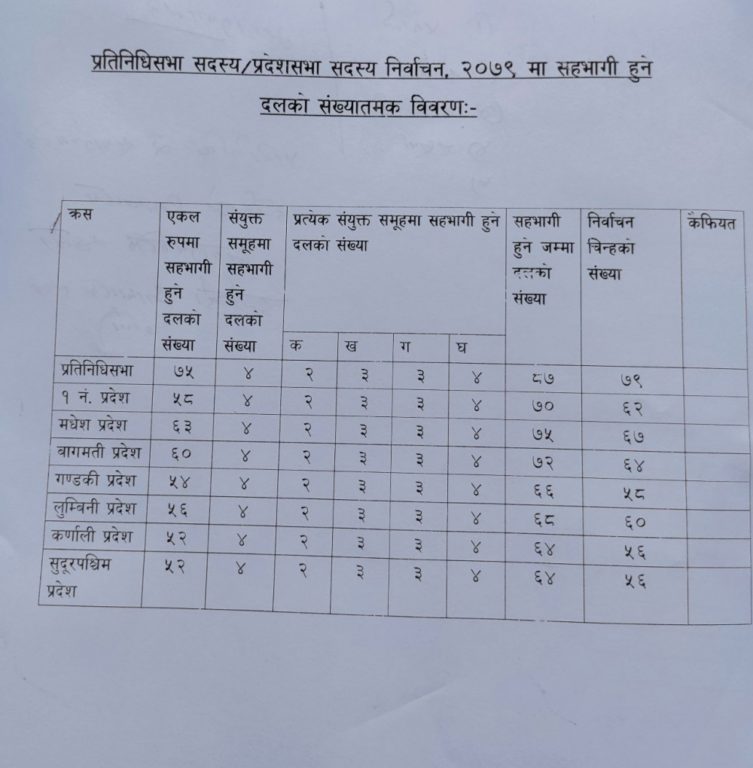 त्यसमध्ये एकल रूपमा सहभागी हुने दलको संख्या ७५ रहेको आयोगले जनाएको छ । त्यस्तै संयुक्त समूहमा सहभागी हुने दलको संख्या ४ वटा रहेको आयोगले जनाएको छ । आयोगका अनुसार प्रतिनिधिसभा चुनावमा लागि ७९ वटा निर्वाचन चिह्न रहेको छ ।
