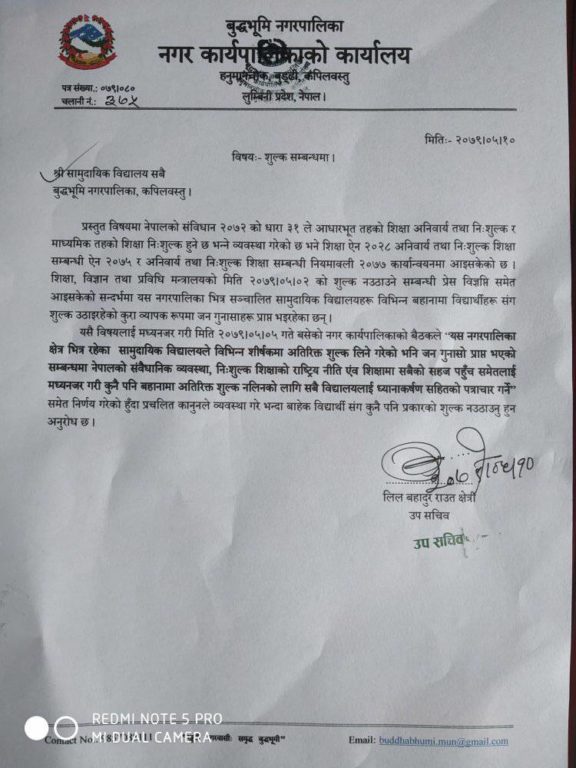 कपिलवस्तुको बुद्धभूमि नगरपालिकाले माध्यमिक तहसम्मको शिक्षामा सामुदायिक विद्यालयले शूल्क लिन नपाउने बताएको छ ।