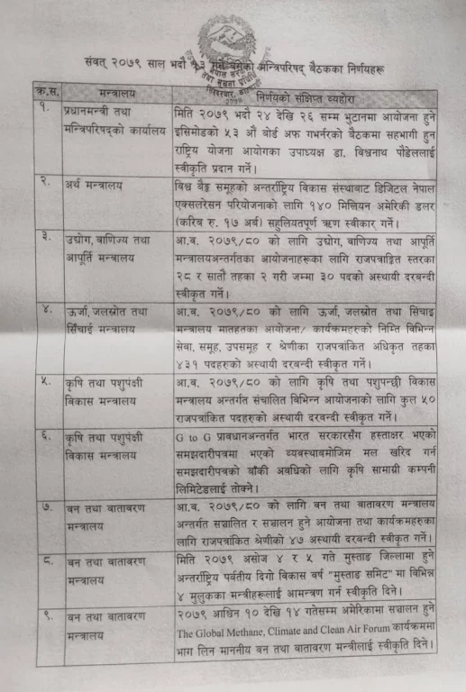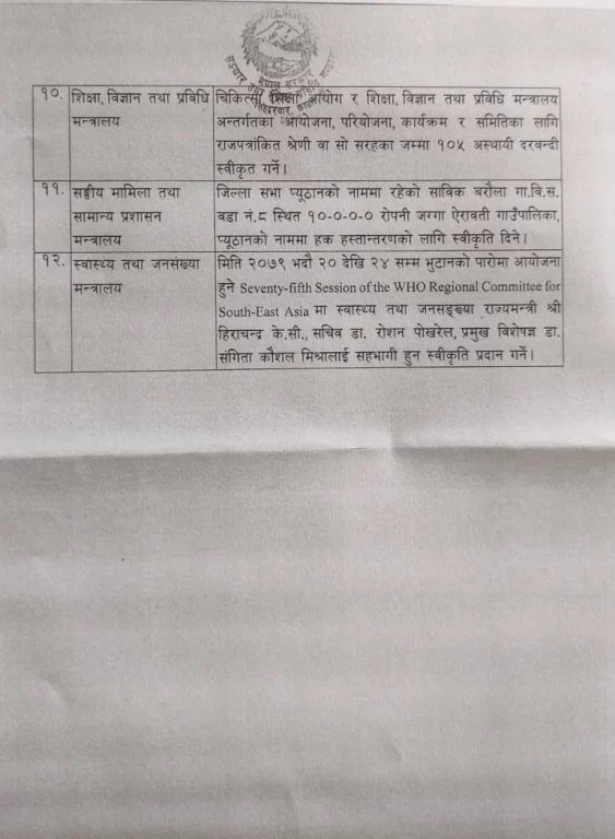 त्यस्तै बैठकले चालू आर्थिक बर्षका लागि ऊर्जा, कृषि, र वन मन्त्रालयका लागि बिभिन्न पदमा अस्थायी दरबन्दी स्वीकृत गर्ने निर्णय गरेको उहाले जानकारी दिए। उहाले विभिन्न आयोजना र कार्यक्रमहरु केहि समयका लागि मात्रै हुने भएकाले हाललाई अस्थायी दरबन्दी मात्रै स्वीकृत गरि गरिएको जानकारी दिए।