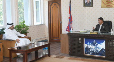 काठमाडौं । संस्कृति, पर्यटन तथा नागरिक उड्डयन मन्त्री जीवनराम श्रेष्ठ र नेपालका लागि कतारका राजदूत