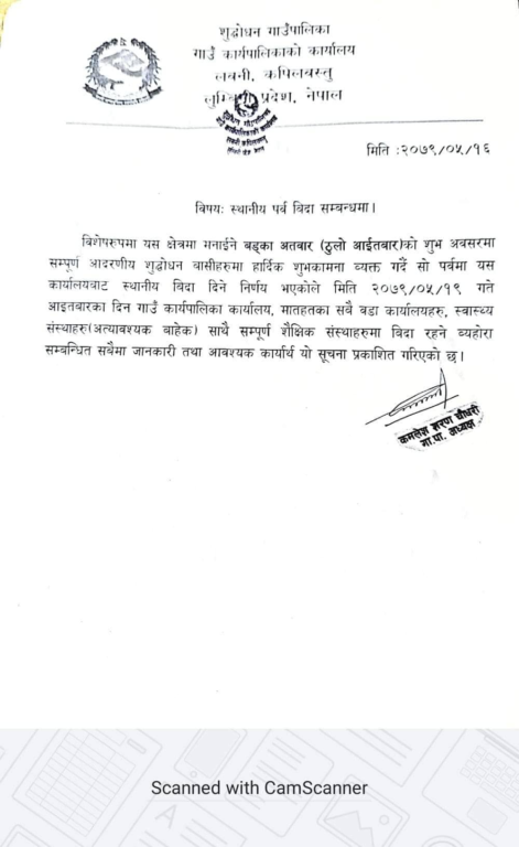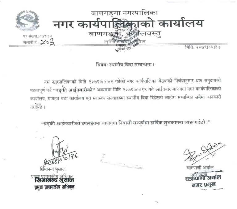 कपिलवस्तुका विभिन्न पालिकाले आउँदो आइतबार स्थानीय बिदा दिएका छन् । थारु समुदायले मनाउने बड्की आइतबारी पर्वको अवसरमा यी पालिकाले स्थानीय बिदा दिएका हुन् ।