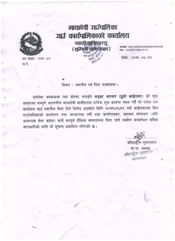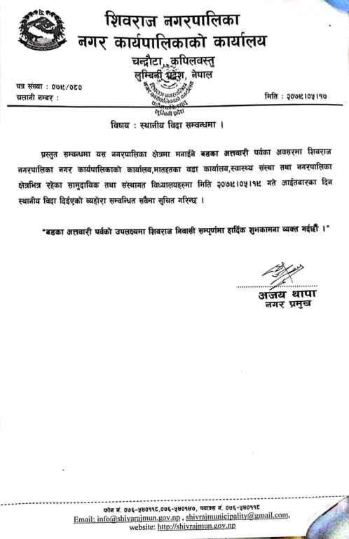 जिल्लाको वाणगंगा नगरपालिका, शिवराज नगरपालिका, मायादेवी गाउँपालिका र शुद्धोधन गाउँपालिकाले शुक्रबार एक सूचना जारी गर्दै आइतबार स्थानीय बिदा दिने जनाएका हुन् । शुक्रबार साझसम्म ४ वटा पालिकाले स्थानीय बिदा दिएका छन् । जिल्लामा १० वटा पालिका रहेका छन् ।
