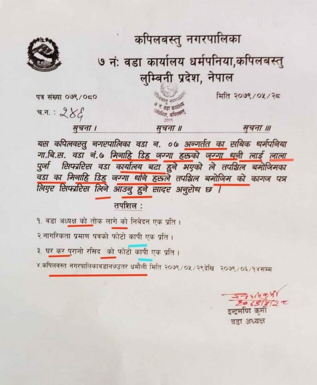 कपिलवस्तु नगरपालिका वडा नं. ७ ले सरकारी लेटरप्याडमा निकालेको एक सूचनामा अशुद्ध नेपाली भाषाको प्रयोग गरिएको छ ।