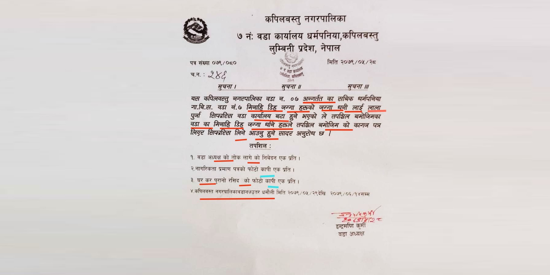 वडाध्यक्ष इन्द्रमणी कुर्मीले निकालेकाृ विज्ञप्ति ।