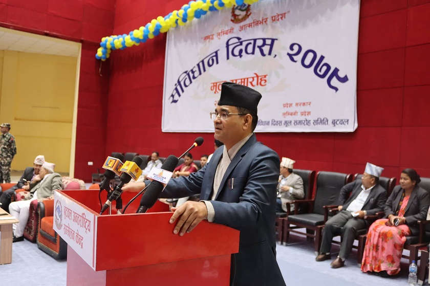 लुम्बिनी प्रदेश सरकारद्वारा सोमबार बुटवलमा आयोजित संविधान दिवस २०७९ को कार्यक्रमलाई सम्वोधन गर्दै उनले संविधान विरोधी प्रवृत्तिलाई राज्यले समयमै चिन्नुपर्ने उल्लेख गरे । लुम्बिनी प्रदेश सरकारले आफ्नो कार्यकालमा नमूना कार्य गरेको बताउँदै उनले त्यसको प्रचार भने पर्याप्त हुन नसकेको बताए । उनले लुम्बिनी प्रदेशका गौरवका आयोजनाका काम जारी रहेको बताए ।