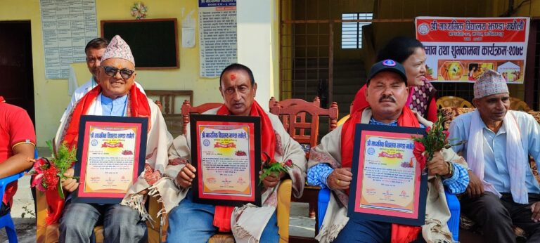 यस्तै बिद्यायमा १० वटा पानीका धारा सहित स्वच्छ खानेपानीको ब्यवस्था गरि दिने स्थानीय समाजसेवी शंकर न्यौपाने, बिष्णु न्यौपाने र अक्षयकोष स्थापना गरि गरिब बिपन्न बिद्यार्थीहरुलाई सहयोग गर्ने स्थानीय समाजसेवी सहयोगिदाता कृष्ण बहादुर खत्रीलाई पनि दोसल्ला र सम्मान पत्रका साथमा सम्मान गरिएको छ ।