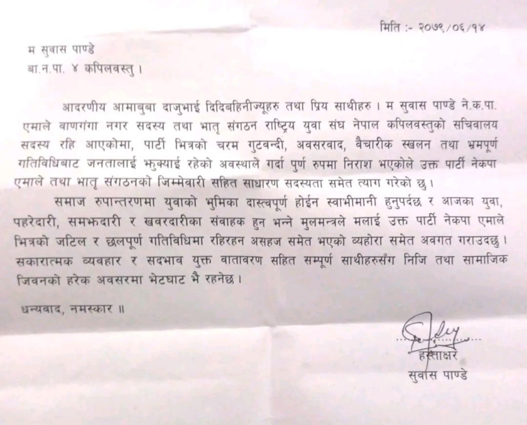 नेकपा एमालेका युवा नेता सुवास पाण्डेले पार्टी परित्यागको घोषणा गर्नुभएको छ । शुक्रबार एक पत्र निकाल्दै पाण्डेले साधारण सदस्य समेत नरहने गरी पार्टी परित्यागको घोषणा गर्नुभएको हो ।