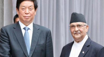 काठमाण्डौ । नेपाल भ्रमणमा रहेका चीनको राष्ट्रिय जनकंग्रेसका अध्यक्ष ली चान्सुले आज उच्चस्तरीय राजनीतिक भेटघाट