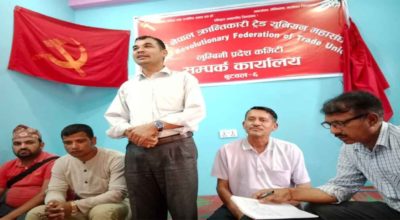 बुटवल । बिहिबार बुटवलमा अखिल नेपाल क्रान्तिकारी ट्रेड युनियन महासंघको लुम्बिनी प्रदेश सम्पर्क कार्यालयको उदघाटन