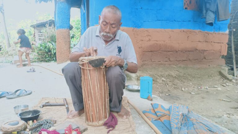 वाणगंगा ६ गन्धर्व टोलमा मादल व्यवसाय बाट राम्रो आम्दानी गरेर जीविकोपार्जन गर्दै आमबे वहादुर गन्धर्व।