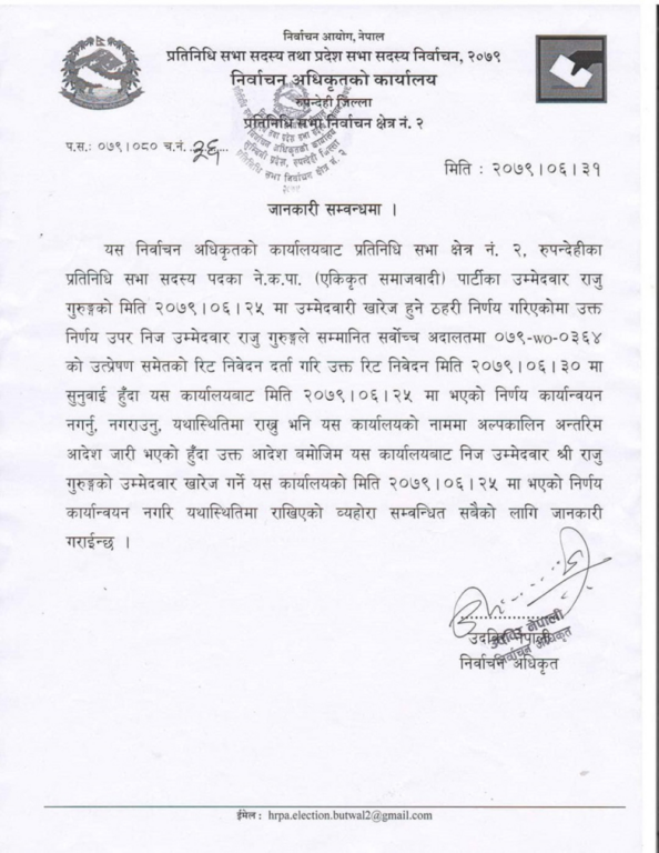‘असोज २५ गते यस कार्यालयबाट गरिएको निर्णय कायाएन्वयन नगर्नु नगराउनु भन्ने अदालतको अल्पकालीन आदेश आएकाले राजु गुरुङको उमेदवारी खारेज गर्ने यस कार्यालयको निर्णय कार्यान्वयन नगरी यथास्थितिमा राखिएको छ,’ निर्वाचन अधिकृतको कार्यालय निर्वाचन क्षेत्र नं २ का निर्वाचन अधिकृत उदवीर नेपालीले जारी गरेको विज्ञप्तिमा भनिएको छ ।