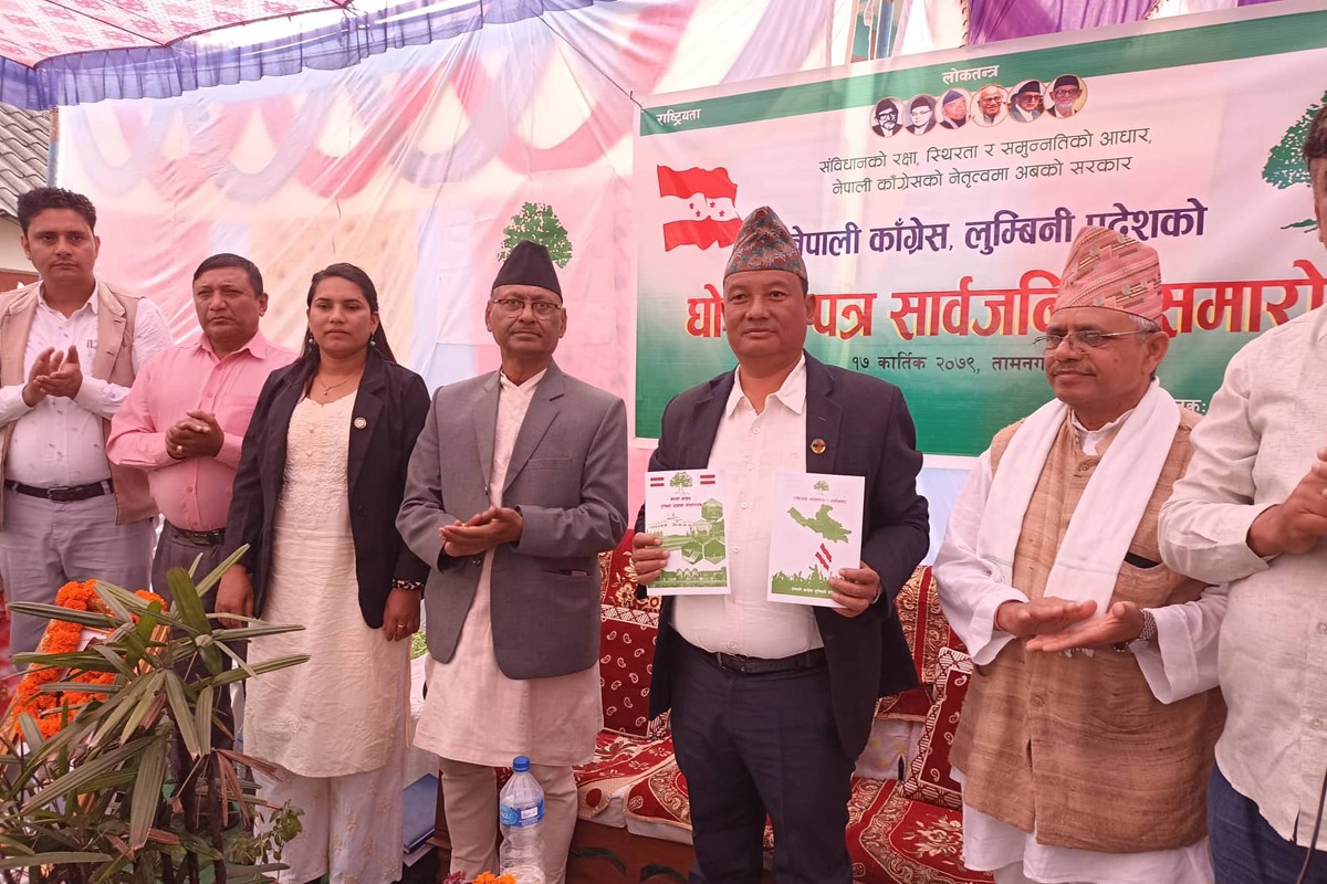 आगामी मंसिर ४ को निर्वाचनलाई लक्षित गरेर कांग्रेस प्रदेश कमिटीले घोषणा पत्र तयार गरेको हो। लुम्बिनी प्रदेशलाई देशकै विकास र समृद्धिको केन्द्र बनाउने लक्ष्य घोषणा पत्रले लिएको छ। त्यसका लागि बुद्ध जन्मस्थल लुम्बिनीलाई केन्द्रित गरेर प्रदेश विकासका योजना अगाडी बढाउने भनिएको छ।