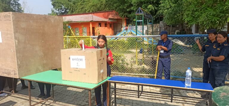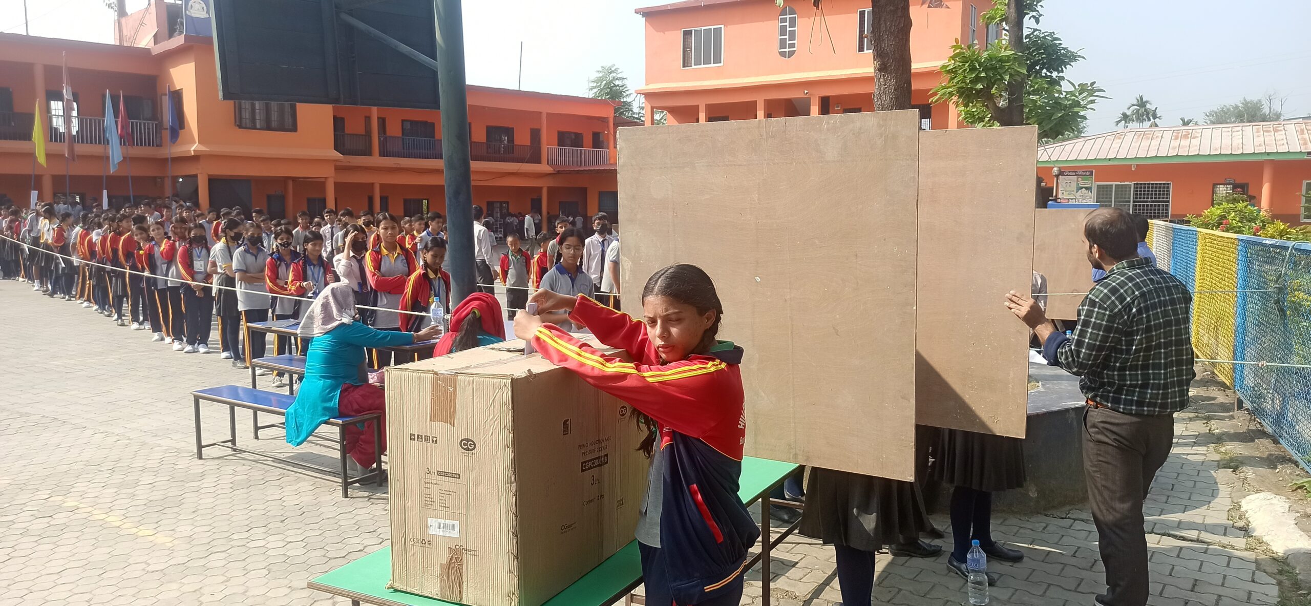 यता मतदान अधिकृतले मतदानको अवलोकन गरिरहेका छन् । विद्यार्थीले एक-एक गरेर आफूलाई मन परेको उम्मेदवार छानिरहेका छन् । दृश्य हेर्दा ठ्याक्कै कुनै निर्वाचनको तयारीभन्दा कम देखिदैनथ्यो ।