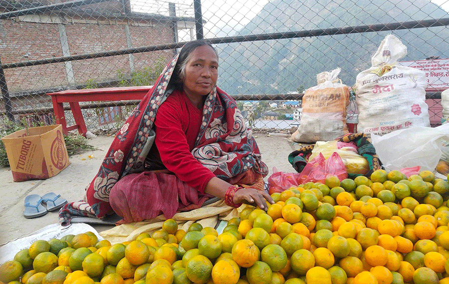 रोल्पा नगरपालिका १० धवाङकी शर्मिला महरा हरेक दिन डोकोमा सुन्तला बोकेर बिक्री गर्न सदरमुकाम आउँछिन । घरबाट सदरमुकाम आउन उनलाई करिब तीन घण्टा लाग्छ ।