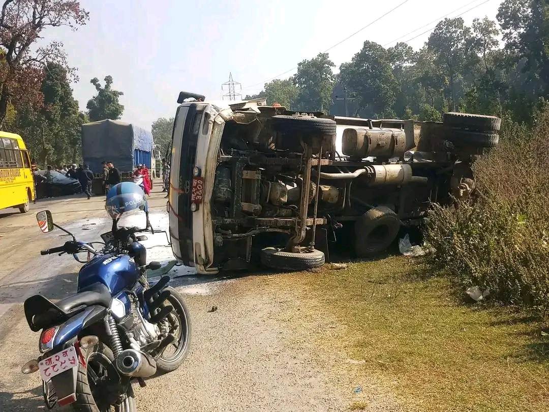 दुर्घटनामा कारलाई कम क्षती भएको छ । ट्यान्कर अनियंत्रित हुँदै सडकमै पल्टिन पुगेको थियो ।दुर्घटना के कति कारणले भएको हो इलाका प्रहरी कार्यालय पिपराले थप अनुसन्धान गरिरहेको छ ।दूध बोकेको सवारी साधन दुर्घटना हुँदा ठुलो मात्रामा दूध नष्ट भएको छ ।