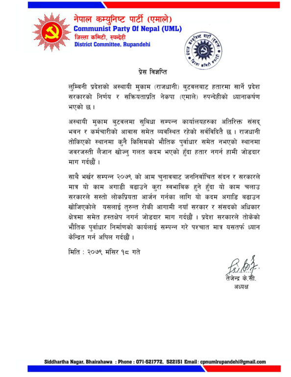 नेकपा एमाले रुपन्देहीले लुम्बिनी प्रदेशको अस्थायी मुकाम बुटवलबाट हतारमा मन्त्रालयहरु सार्ने प्रदेश सरकारको निर्णय र सक्रियता तत्काल रोक्न माग गरेको छ ।
