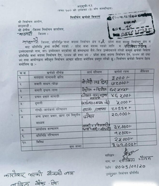 हेर्नुहोस् सोविता गौतमले निर्वाचन कार्यालयमा बुझाएको चुनावी खर्च विवरण