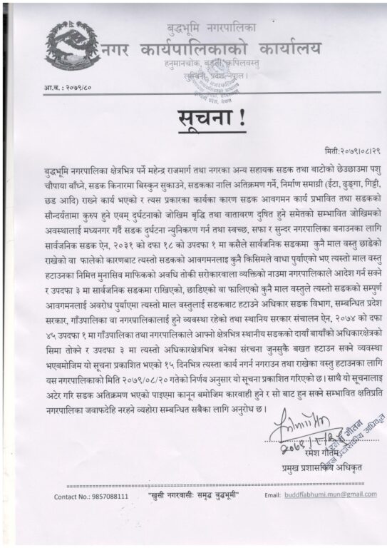 कपिलवस्तुको बुद्धभूमि नगरपालिकाले सडक अतिक्रमण हटाउने गृहकार्य थालेको छ । नगरपालिकाले एक सार्वजनिक सूचना निकाल्दै नगर क्षेत्रभित्र पर्ने महेन्द्र राजमार्ग तथा नगरका अन्य सहायक सडक तथा बाटोको छेउछाउमा पशु चौपाय बाँध्ने, सडक किनारामा विस्कुल सुकाउने, सडकका नाली अतिक्रमण गर्ने, निर्माण सामग्री राख्ने कार्य बन्द गर्न आग्रह गरेको छ ।